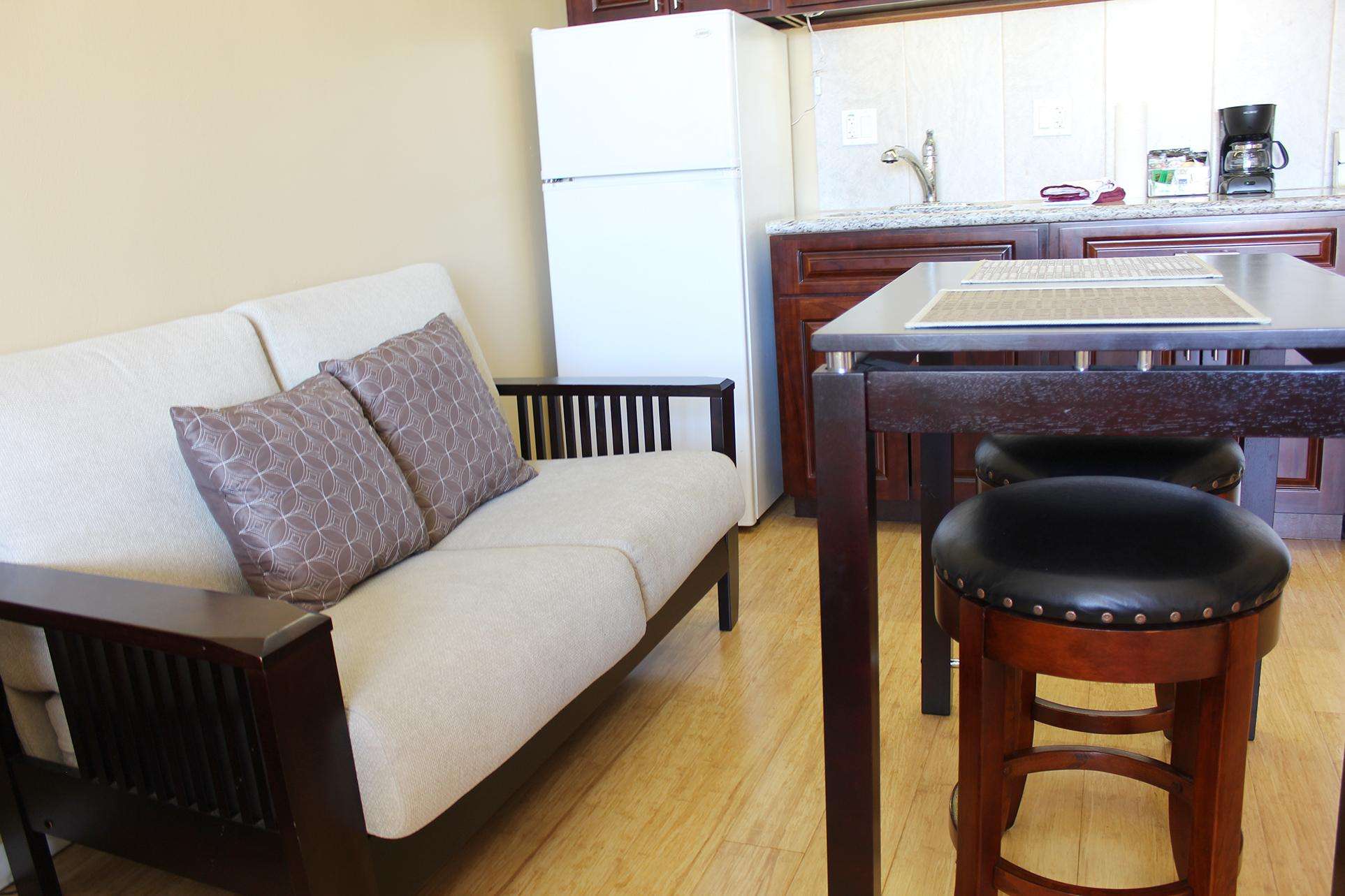 Living - WiFi, Balcony/Lanai, Parking Included, Bed linens, towels, beach towels, Air Conditioning (Window), Non-Smoking, Kitchenette (no dishwasher), King Bed, Ironing Board and Iron, Dishes-Silverware, DVD, Flat Screen TV, Hair Dryer, Vacuum Cleaner, Window A/C, Laundry Facilities on Each Floor, Access Bathroom from Living Area, Clock Radio